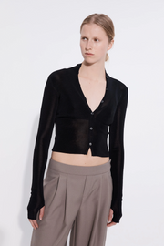 The Multi Button Cropped Cardi in Black from Sener Besim is a trans-seasonal staple crafted from a sheer Italian viscose-nylon blend that stretches to fit the body. Designed with a cropped silhouette and delicate button-up front, this lightweight cardigan is ideal for layering and serves as a versatile foundation piece across seasons.