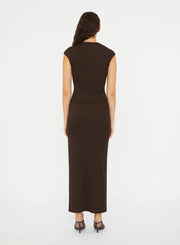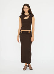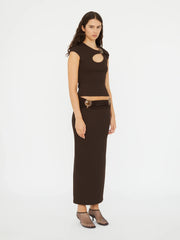 The Mineral Stone Ruched Skirt in Espresso from Christopher Esber features dual custom Tiger Eye hardware at the hips. Cut from ribbed jersey in a column-like silhouette, it balances a mid-rise waist with fluid movement through the hem. Pair with the matching ring-detailed top for a directional set.