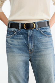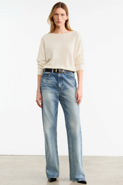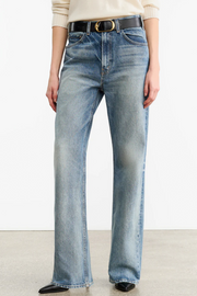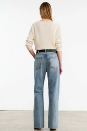 The Mitchell Jean in Summer Wash from Nili Lotan is cut in premium Japanese heavyweight crosshatch denim, designed to soften and evolve with wear. Featuring a mid-rise waist, relaxed straight leg, and classic five-pocket detailing, the silhouette is elevated by artisanal hand-washing techniques that create subtle variations in wash and texture. Finished with a shank closure, belt loops, and this style is intended to wear low on hips.