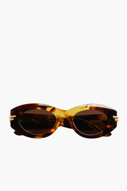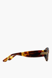 The Mitre Oval Sunglasses in havana/brown from Bottega Veneta sunglasses are made in Japan from Eastman Acetate Renew, an innovative material incorporating 27% recycled content. The bold oval silhouette is paired with sustainable polyamide lenses featuring 39% bio-based content—blending elevated aesthetics with eco-friendly sensibility. Ideal for daily wear, these sunglasses embody refined minimalism and lasting quality.