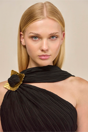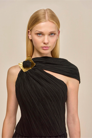 The Moira Top in Black from Cult Gaia is striking origami plissé top designed with sculptural precision. Featuring an asymmetric off-shoulder neckline and finished with gold-toned pleated hardware, the silhouette balances modern edge with architectural femininity.