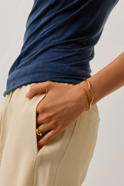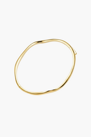The Molten Classic Hinged Bangle in gold from Missoma captures the essence of organic form with a high-polish finish and fluid, undulating curves that wrap elegantly around the wrist. Its sculptural silhouette adds dimension and refinement, making it a striking standalone statement or a complementary piece in your stack. Featuring a secure hinge clasp, it’s crafted in 18ct recycled gold vermeil, ensuring a sustainable, timeless addition to any jewellery collection.