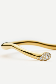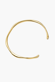 The Molten Snow Torque Statement Necklace in gold from Missoma offers a modern take on timeless gold jewellery. Crafted in 18ct recycled gold vermeil, this open-ended collar silhouette gently curves around the neckline with a fluid, organic form. The ends are subtly tipped with pavé-set stones, adding a refined sparkle that catches the light with every movement. A standout piece whether worn alone or layered.