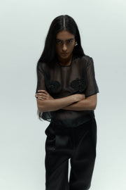 The Beaded Ophelia Tee in Black Organza from Harris Tapper is a captivating piece crafted from luxurious black silk organza. This short-sleeved, sheer t-shirt features delicate black orchid appliqué details on the chest. Lightweight and ethereal, it’s perfect for layering or pairing with high-waisted trousers for a chic, statement look.