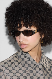 The Oval Frame Sunglasses in Tortoise Shell from Gucci are inspired by the summer spirit of the Italian coast. Featuring ab oval frame with Interlocking G cut-out temples and solid brown lenses, they offer a modern take on vintage silhouettes. Pair yours with any vacation look for a chic coastal-inspired finish.