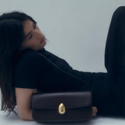 The Phoenix Leather Baguette in Dark Chocolate by Neous reimagines the brands signature Phoenix Cross Body silhouette in a leaner baguette form that sits comfortably on the shoulder using a single structured strap, while maintaining its gold spherical magnetic closure.