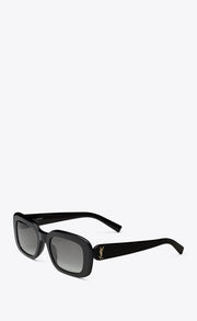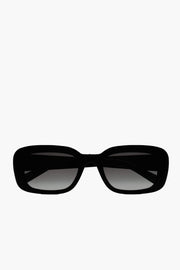 The Pillowed Rectangular Sunglasses by Saint Laurent in Black feature classic square rounded frames in bold acetate. These sunglasses are constructed with black tinted lenses and are finished with gold 'YSL' logo on each of the arms. Pair with a white shirt and tailored trousers.