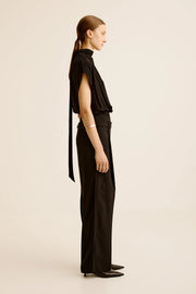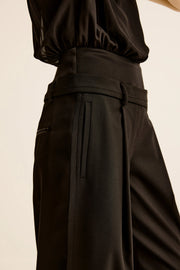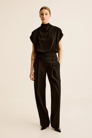 The Portia Duo Trouser in Black from Esse Studios is a modern take on classic tailoring, featuring a unique integrated waistband that combines a fitted high-rise panel with a dropped overlay for a layered effect. Crafted with side pockets and a sleek, invisible back zip, this style offers a refined, structured silhouette. Style with the Aire Bodysuit and pointed heel for a chic evening look.