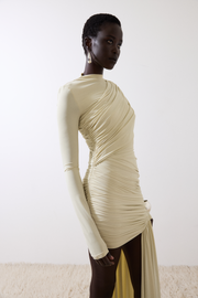 The Ravel Mini Dress in Cream from De La Vali is a sculptural evening piece designed to captivate. This form-fitting dress features full-length sleeves and precision-placed ruching throughout the body to create flattering dimension. A high neckline adds refinement, while the dramatic asymmetric skirt panel offers a bold, cascading finish from the thigh.
