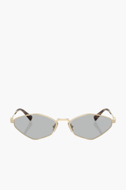 The Regard Metal Geo Sunglasses by Miu Miu in Gold/Grey are a metal sunglass with a cool, unique look. Featuring thin metal rims and irregular lenses, this style is finished with sleep temples decorated with the Miu Miu logo.