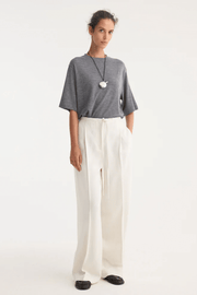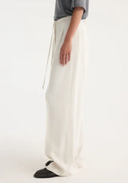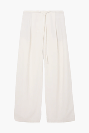 The Relaxed Drawstring Trousers in Winter White from RÓHE offer a balance of elegance and ease, crafted from a soft and airy fabric for fluid movement. Designed with a long, flowing silhouette, they feature front pleats, back welt pockets, and a casual-chic drawstring waistband for an effortlessly refined look. Pair with a fitted knit or oversized blazer for a versatile, polished ensemble.