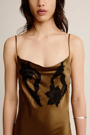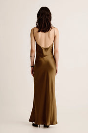 The Rosa Cowl Dress in Dark Olive by Esse Studios is a delicate, vintage-inspired silk dress. With intricate lace detail, this dress features a cowl neck, thin straps and is falls gently off the body. Designed to be simply beautiful, style with a strappy heel and minimal jewellery for your next event.