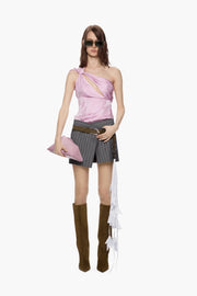 The Sam Top in Sugar Pink by The Attico features an asymmetrical neckline with front and back cut outs. The Sam Top is made from viscose, featuring The Attico embroidered logo throughout the Sugar Pink fabric. Pair the Sam Top with the brands Cloe Mini Skirt in either white leather or grey and white pinstripe.