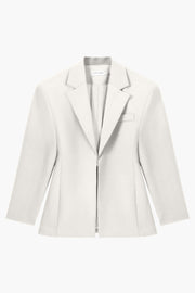 The Scuba Wool Blazer in Ivory by Courtney Zheng features a fitted silhouette with sharp, padded shoulders and clean notch lapels. Designed with a single hook-and-eye closure and a defined waist, it offers a polished, structured look. Wear it with the Belted Scuba Shorts for a coordinated, day-to-night ensemble or pair with tailored trousers for a sleek office-ready outfit.