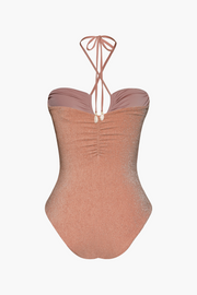 The Coral Reef One Piece in Soft Peach by Johanna Ortiz is a halter swimsuit with elegant ruching and a keyhole cutout, offering a classic vacation-ready silhouette. Finished with an adjustable tie at the neck, it provides versatile styling and pairs beautifully with the matching skirt for a complete resort look.