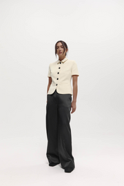 The Short Sleeve Bardot Blazer in Bone from Harris Tapper is tailored in bone bonded suiting with a contoured waist referencing 1950s tailoring. It features a pointed collar, five-button closure, and front jet pockets for a timeless, structured finish. Pair with slim-fit trousers or a column skirt for a modern take on classic tailoring.