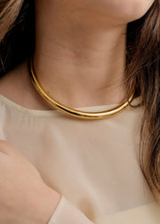 The Slide on Necklace by Anna Rossi in Gold is an elegant understated choker style necklace. Tapered in appearance with softly polished ends this necklace is designed to slide on. Style over a collared shirt or the perfect addition to your outfit.