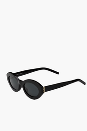 The Slim Oval Acetate Sunglasses in Black by Saint Laurent offer a refined everyday silhouette with a sculptural, vintage-inspired shape. Crafted from polished acetate with tonal nylon lenses, they feature the maison’s iconic metal Cassandre hinges for a subtle signature finish. Designed for both style and function, these frames provide full UV protection and are compatible with prescription lenses.
