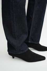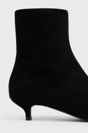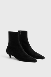 The Slim Suede Ankle Boots in Black from TOTEME are a refined everyday style crafted from premium suede leather. Designed with a sleek, close-fitting silhouette, they offer a streamlined look that pairs effortlessly with both tailored and casual outfits. Set on a low heel, they provide comfort and subtle elevation for all-day wear.