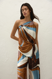 The Sotto Top in Notte from Faithfull The Brand is a resort-inspired silhouette crafted from a luxurious viscose satin blend, detailed in a distinctive 1970s-inspired geometric print. Designed to drape effortlessly off the body, it features a one-shoulder neckline with mock knot detailing at the shoulder and side waist. An asymmetric hem enhances the fluid shape, creating elegant movement. Style with the matching Jensen Pant for a polished vacation set.