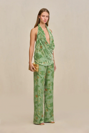 The Stacie Pant in Moldavite from Cult Gaia is a bias-cut sleek silk burnout pant designed to sit at the mid to high waist. With a fluid drape and relaxed fit, these pants offer understated elegance and effortless wearability. The slip-on style ensures ease of dressing, making them a versatile wardrobe piece that can be paired back with the Augusta Top for a chic coordinated look.