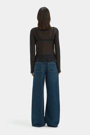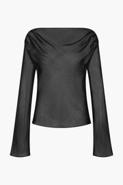 The Strobe Long Sleeve Cowl Top in black from SIR features a relaxed fit with a fluid cowl neckline that can be worn on or off the shoulder. Designed with long sleeves and a subtle flare at the cuffs, it includes discreet snaps at the inside shoulders to attach to undergarments for a secure fit. The lightweight semi-sheer fabrication drapes elegantly, offering a refined, ethereal look. Pair with high-waisted tailored pants or a satin midi skirt for an effortless evening outfit.