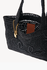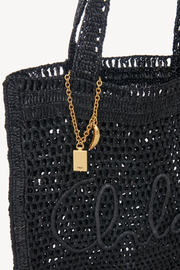 The Summer Banana Tote Bag in Black by Chloé is a celebration of craft and conscious design. Handwoven in Madagascar by a single artisan over 4.5 days in collaboration with Made For A Woman, the tote features a raffia body with calfskin trims, creating a textural contrast and elevated silhouette. The front is adorned with a heritage-inspired, handwritten signature and finished with a dangling chain and charms, adding a personalized, artisanal touch. A timeless summer staple with meaningful impact.