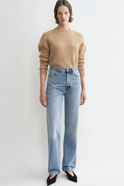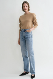 The Twisted Seam Denim in Worn Blue by TOTEME are crafted from 100% organic cotton with a relaxed, straight-leg fit. Designed with a button fly, silver-tone hardware, and directional side seams, they feature five pockets, belt loops, a finished hem, and a leather patch for signature detailing. Wear them with a tucked-in tee and sneakers for a casual, timeless look.