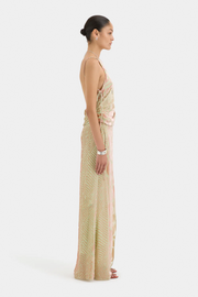The Ventura Top in Daisy Stripe by SIR is a romantic statement piece crafted from a silk–viscose burnout with a velvet pile and sheer mesh base. Featuring a tie detail at the shoulder, side tucks for soft shaping, and an open back, it balances structure and femininity. Wear it with the matching Ventura Skirt for a refined coordinated look.