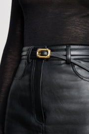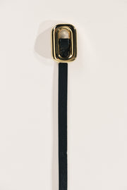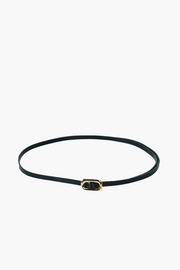The Venura Belt in Black/Gold from Déhanche is a sleek, minimalist accessory that balances bold design with everyday elegance. Crafted in Italy from smooth leather, it features a sculptural gold-tone buckle and a slender silhouette for refined styling. The adjustable design allows for versatile wear—perfect for cinching dresses or defining tailored looks.