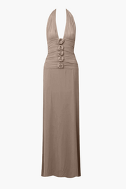 The Villadiego Dress in Pétalo by Maygel Coronel is an elegant halter-neck silhouette that features a deep V neckline and a softly draped bust, with signature ruching at the straps. The handcrafted floral embellishments adds dimension and artistry, while a fluid A-line skirt and dramatic open back finish the look with sophistication.