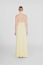 The Villadiego Dress in Vanilla by Maygel Coronel is an elegant halter-neck silhouette that features a deep V neckline and a softly draped bust, with signature ruching at the straps. The handcrafted floral embellishments adds dimension and artistry, while a fluid A-line skirt and dramatic open back finish the look with sophistication.