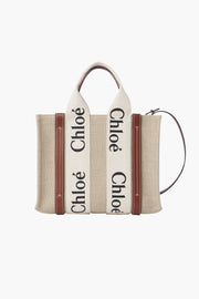 The newest 'Hybrid' version of the Woody Small Tote Bag in White and Brown by Chloé is crafted from lower-impact linen canvas detailed with shiny calfskin strips. This small Woody Tote Bag is a compact day-to-evening bag with a strong summer attitude. The roomy inside compartment includes a practical flat pocket. The bag's sharp, modern lines are emphasised by the contrasting vertical leather strips and the signature Chloé logo ribbon carried over from the Maison's Woody mule. Carry this small purse in hand.